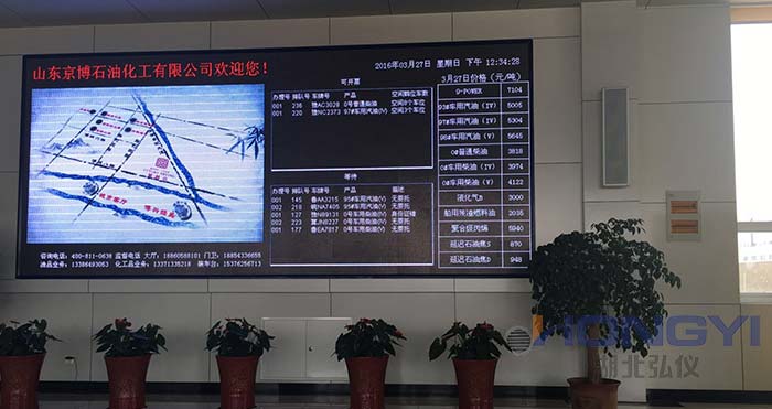 為了能直觀的顯示裝車區(qū)的裝車鶴位運行狀態(tài),方便司機實 時了解進場裝車進度,在裝車候車區(qū)設置—套大屏器顯示,大屏幕顯示與計算機連接,接收計算機的指令顯示相關的內容。