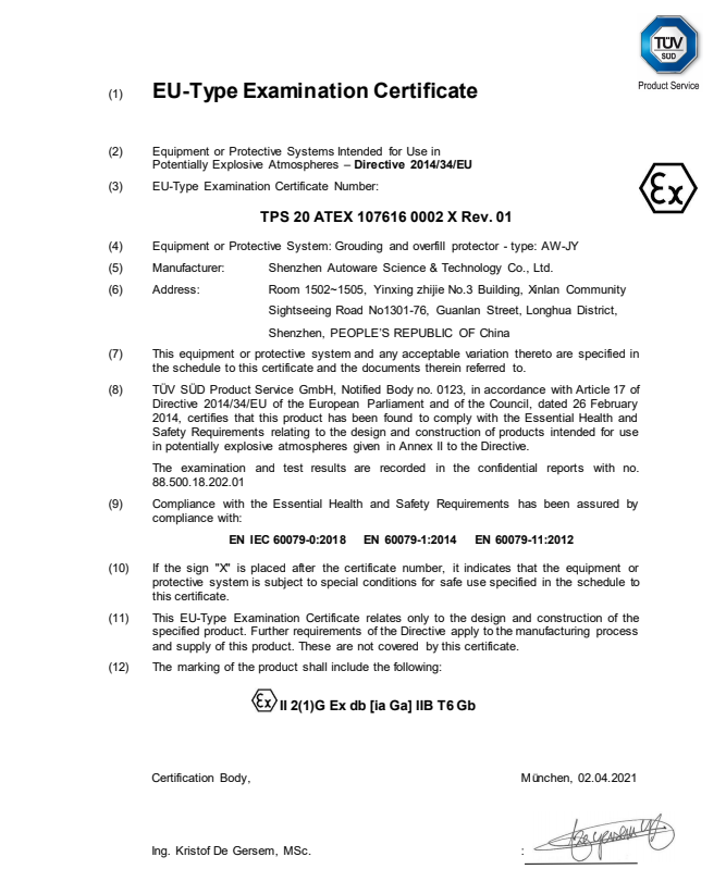 防爆證號TPS 20 ATEX 107616 0002 X